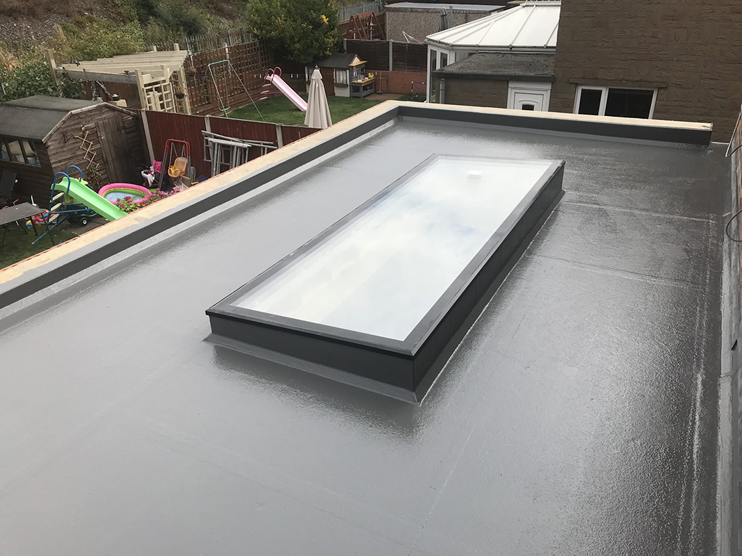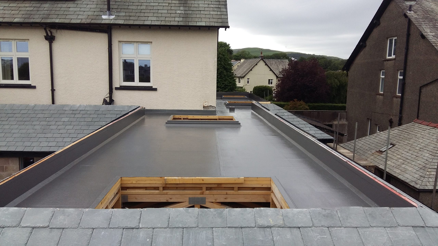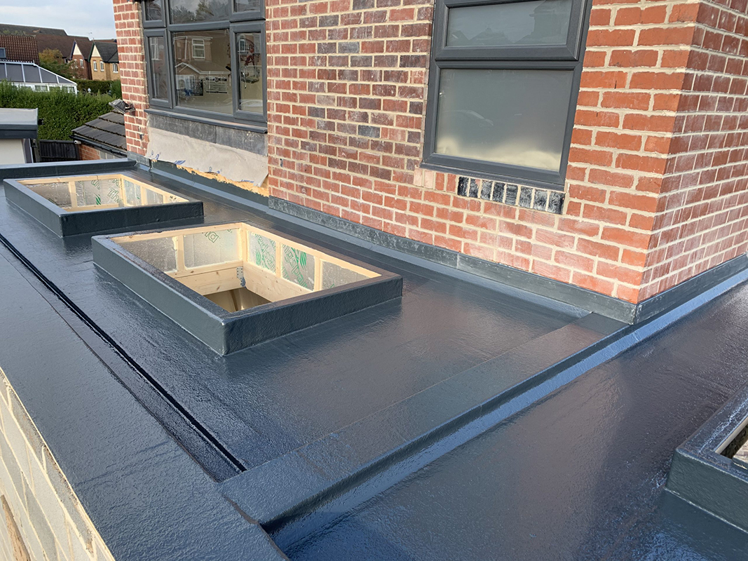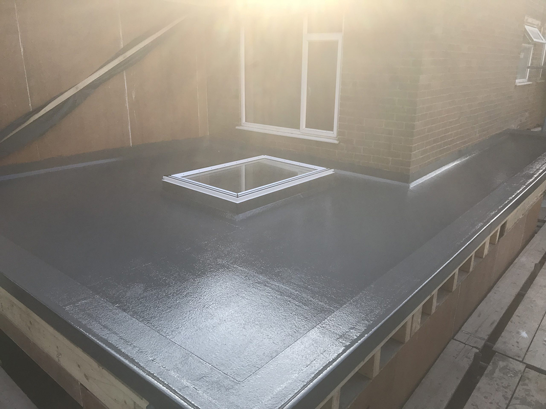 GRP flat roofs begin with a layer of catalysed resin being applied to good quality, completely dry roof decking, ideally OSB3 wood. A layer of fibreglass matting is then laid on top followed by another layer of catalysed resin to complete the system. Once cured, a fire retardant top coat resin is then applied to completely weatherproof the roof and give it a more attractive finish.